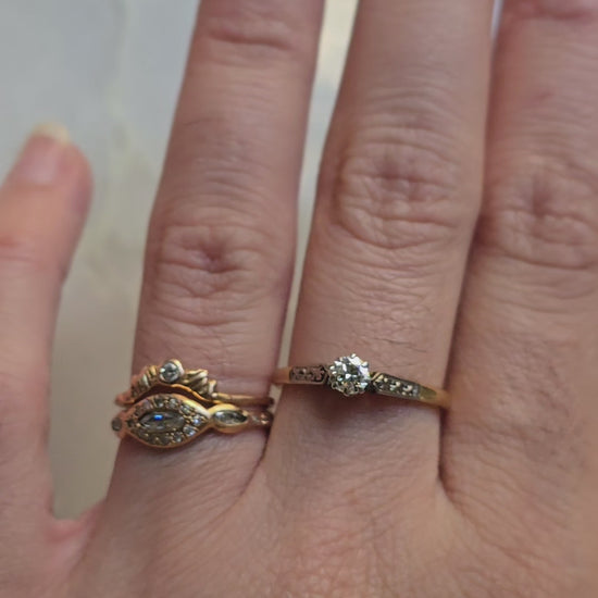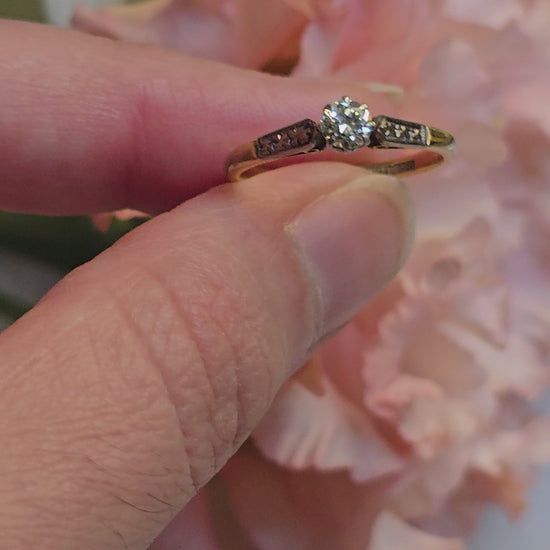 Made of buttery 18k gold and cool white platinum, it features a very nice approximately 1/4 carat diamond (3.75mm) in a sparkling old brilliant cut, with great color, clarity and bright rainbow scintillation. The platinum shoulders are engraved with a sweet floral pattern, and the diamond is securely held with petite claw prongs. Please note that I cannot provide the color, clarity, or exact carat weight of the diamond.
