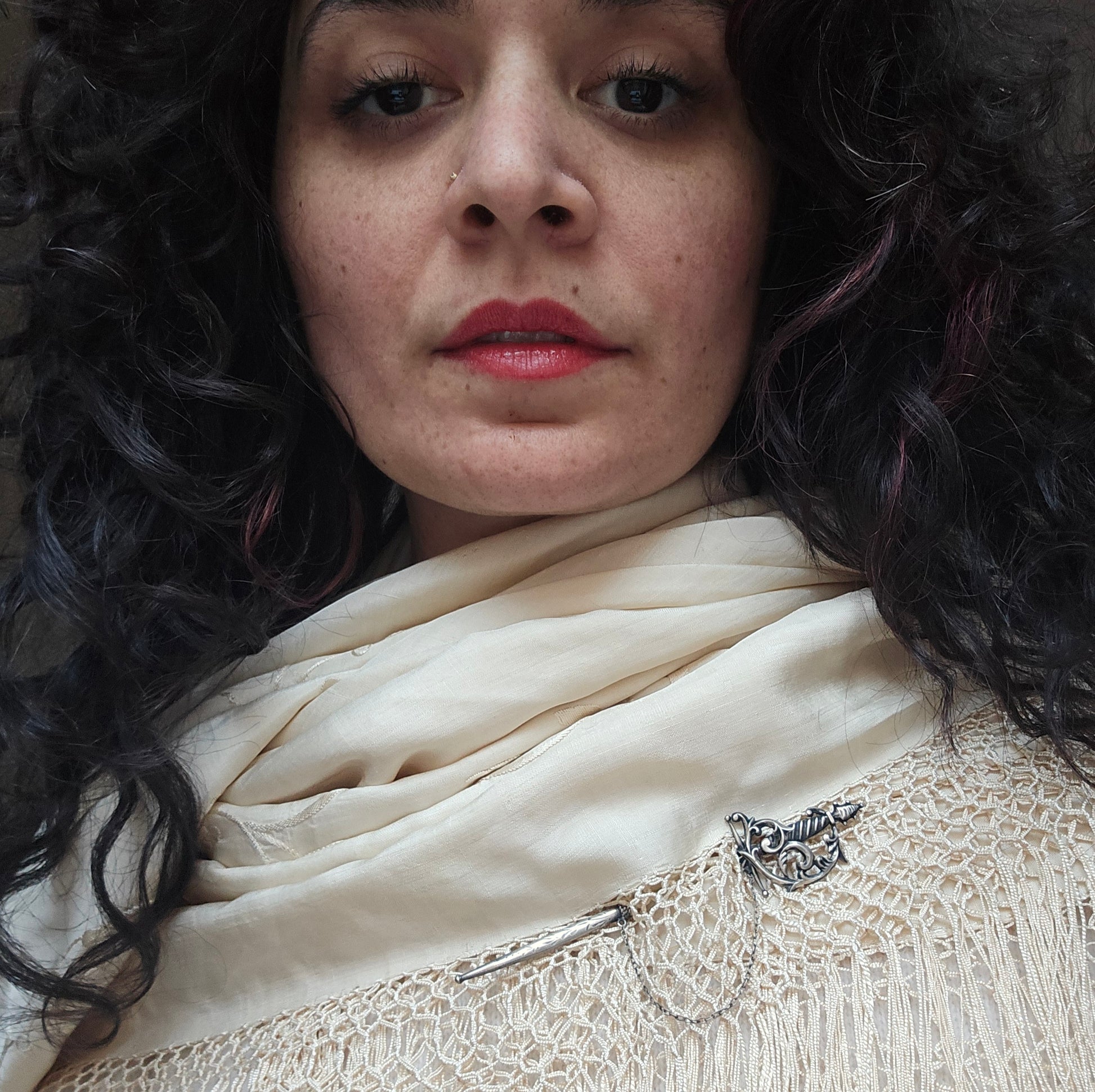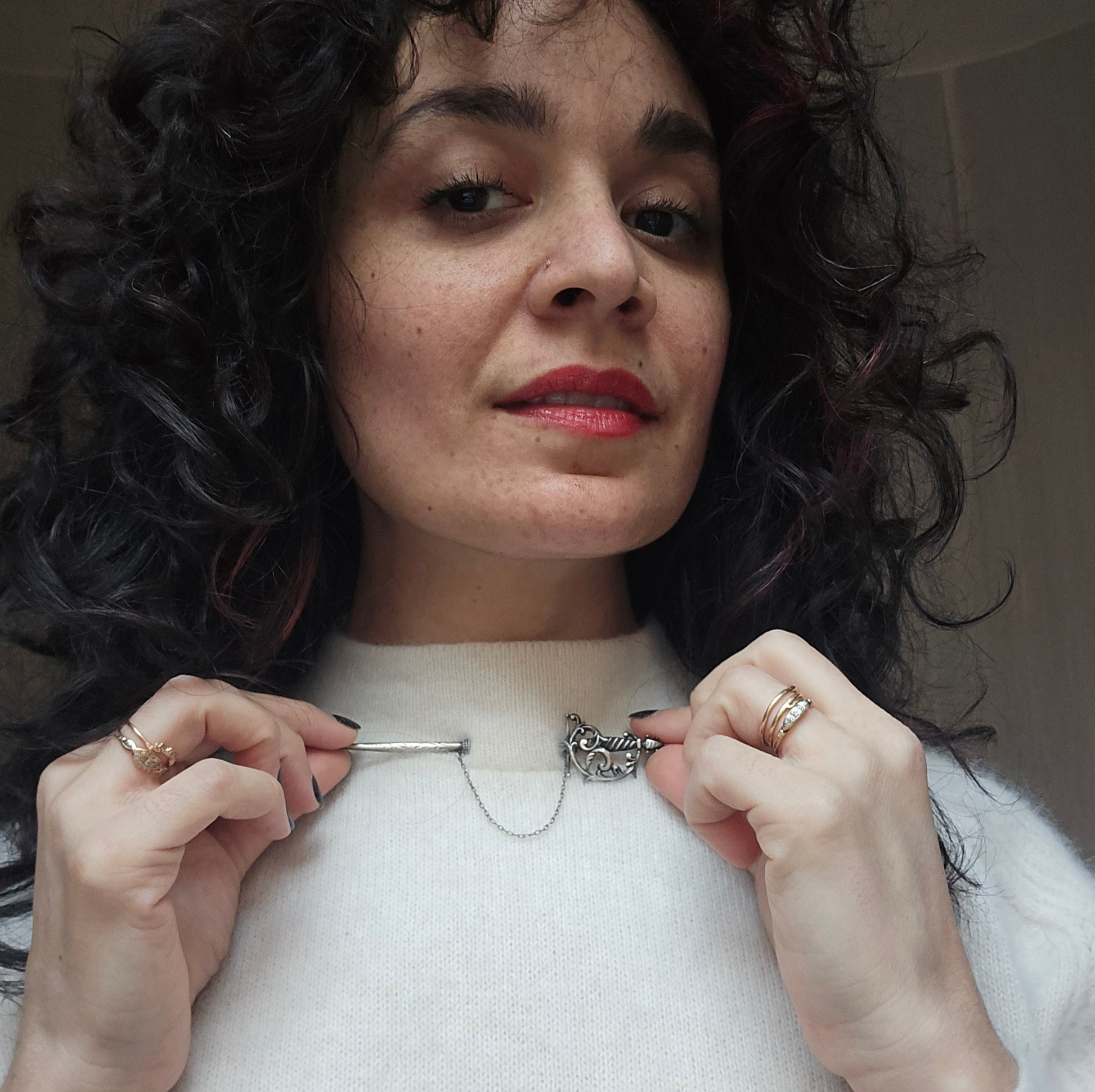 While we may think of the Edwardian era as particularly stuffy, there were many whimsical and interesting trends, especially in the world of jewelry. One of the most wonderful is the sword shaped jabot pin- initially intended to pin fancy lace jabots to blouses and dresses, it eventually evolved into a versatile piece of jewelry that could adorn anything from a dress bodice to a hat. Here is another wonderfully ornate example of this functional and dramatic piece of jewelry, fashioned to look like a sword or fencing rapier with an elaborate pommel/handle.