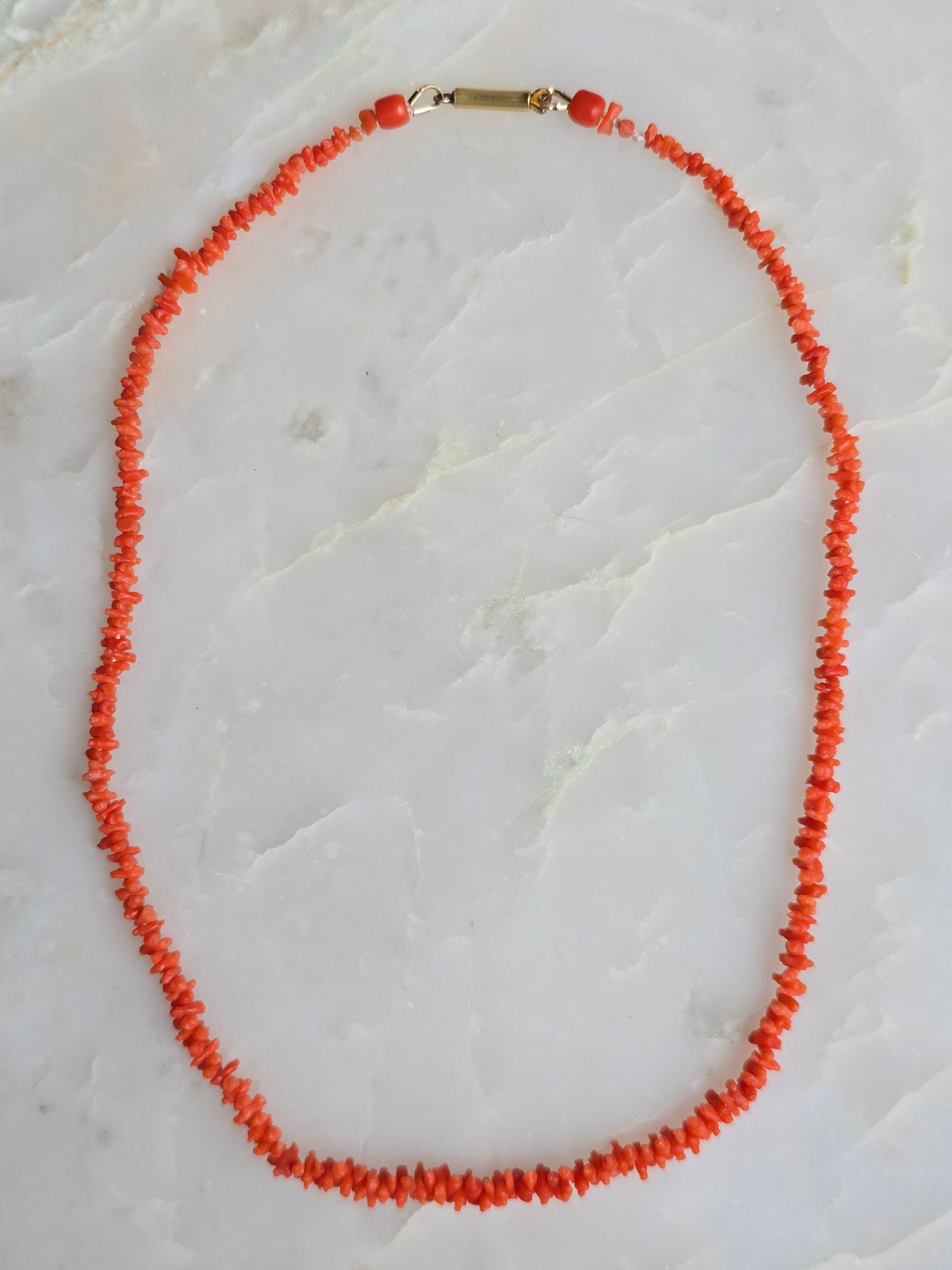 Another exceptional example of the skilled coral carving that was in fashion during the early 19th century, this dainty necklace is composed of carved Mediterranean coral beads in what is known as a "rolling pin" shape, in graduated sizes. The necklace fastens with its original barrel clasp, made of rolled gold or gold fill. The ends of the necklace feature two slightly larger coral beads.