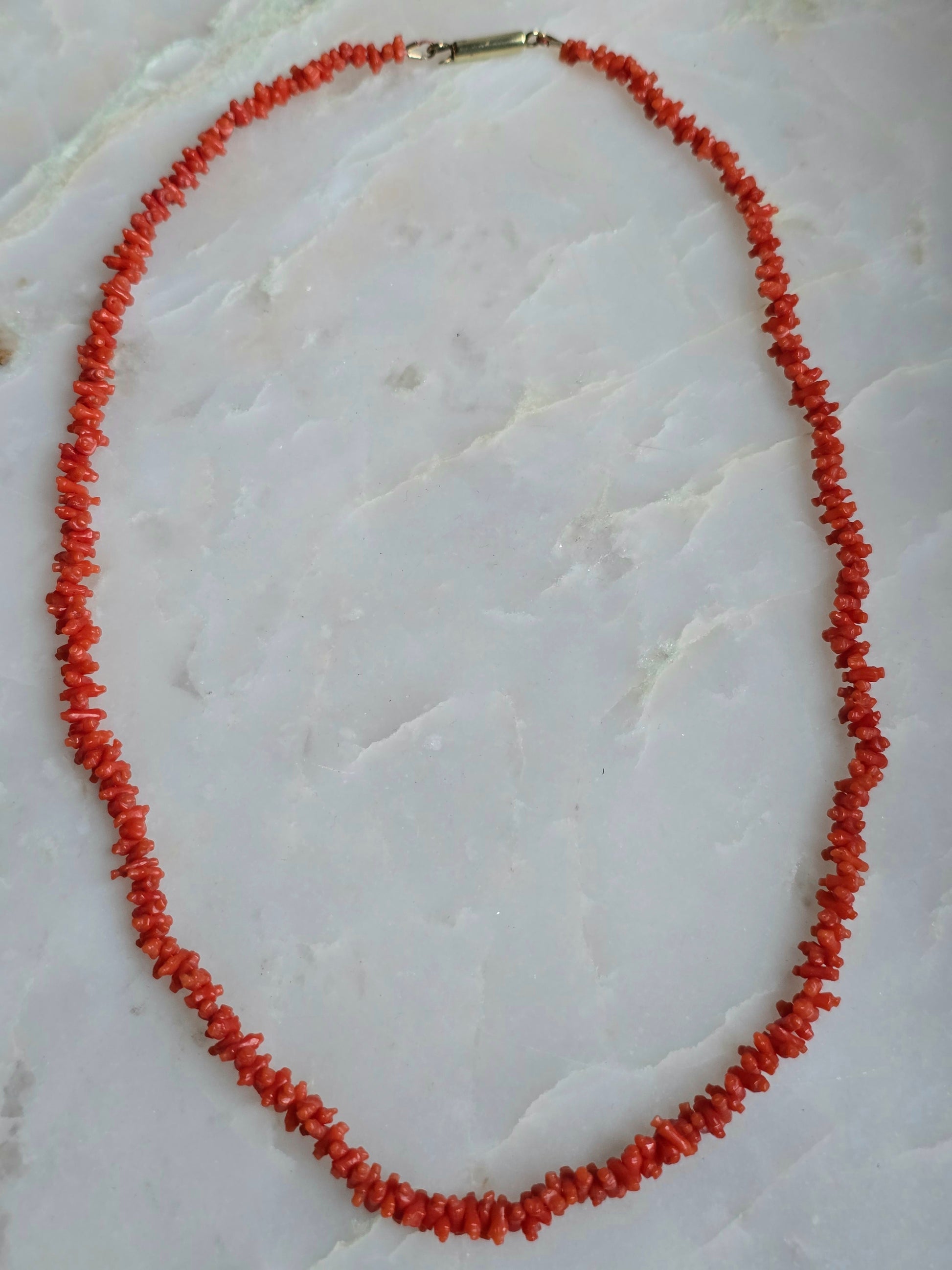 This is the longest of these "rolling pin" style necklaces I have been able to find so far, measuring a respectable 18". These carved coral necklaces have become somewhat of an obsession for me, and I never cease to marvel at the time and skill that was required to carve each and every tiny coral bead. Made of natural, untreated Mediterranean coral in an incredibly vibrant shade of orange, it is an absolutely timeless piece.