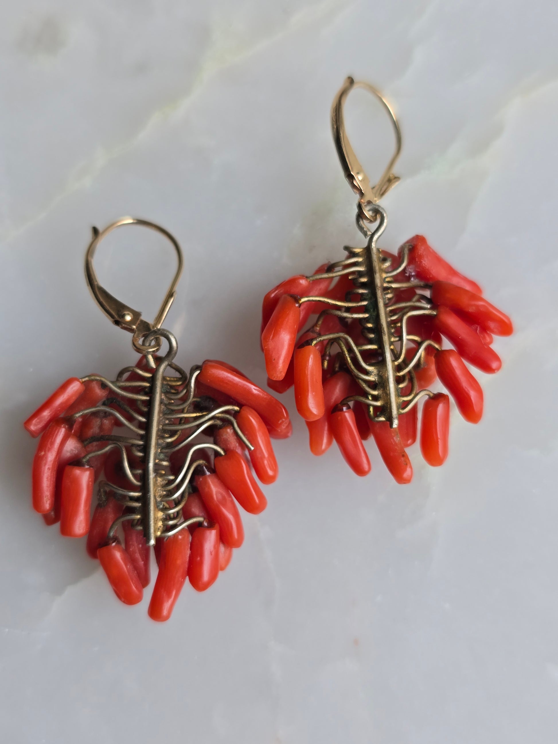 A timeless classic, these late 19th century earrings are made of dense clusters of bright red Mediterranean coral branches and "berries," set on silver wires. The earring hooks have been replaced with modern 14k leverbacks- I found these with modern gold fill replacements, which were not a good match for the coral. They most likely originally had silver hooks.