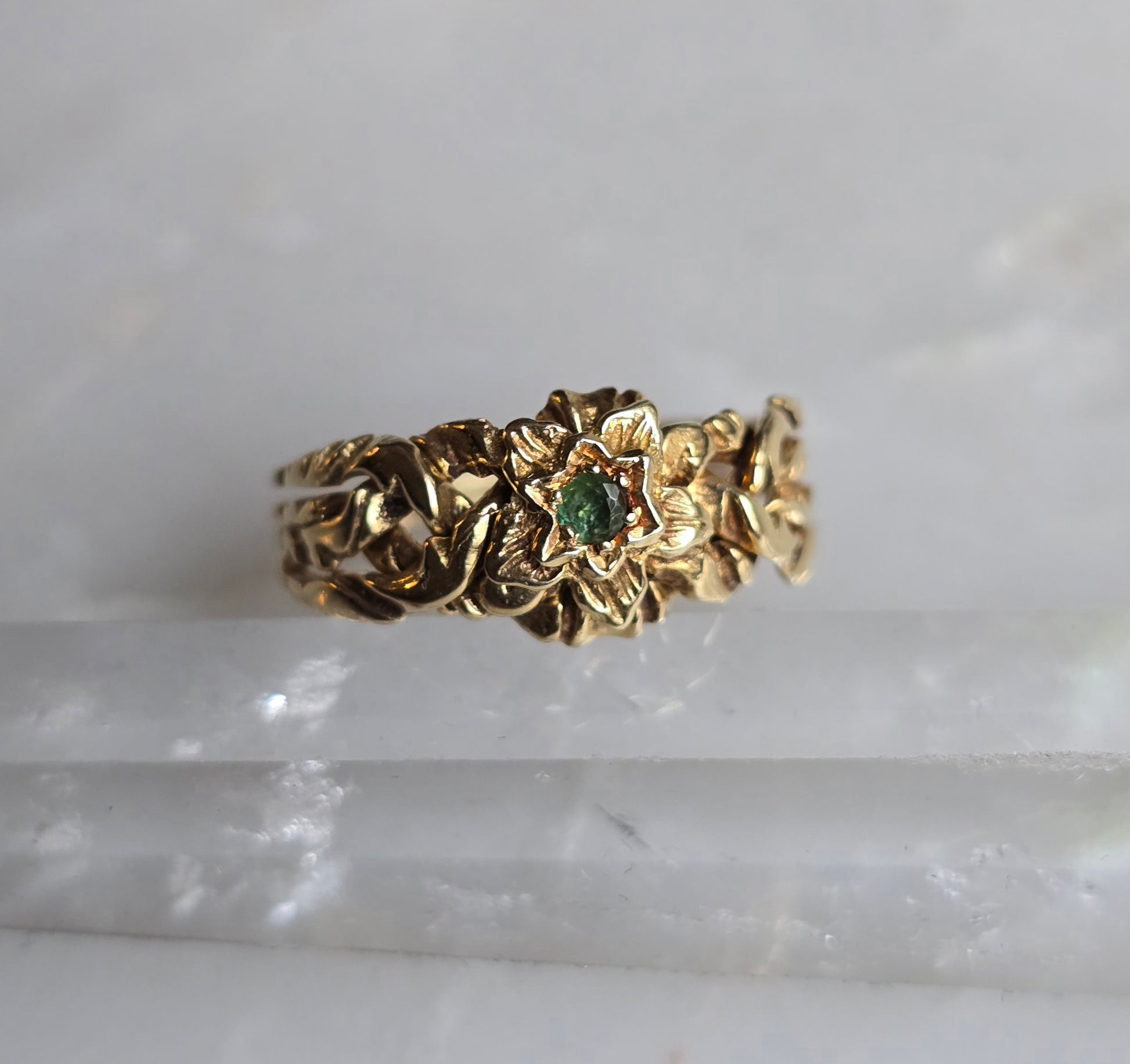 With its origins in Ottoman era harems, puzzle rings are an enduring part of the Turkish goldsmithing tradition. In fact, apprentice jewelers and goldsmiths are still often required to learn how to construct a puzzle ring as part of their training! Made of four interlocking bands that only fit together when layered a specific way, they are a charming (and, if you don't know the proper steps, infuriating) addition to any jewelry collection. This particular example is made of 14k yellow gold, in a beautiful and ornate flower and scroll pattern, and is set with a small natural emerald.