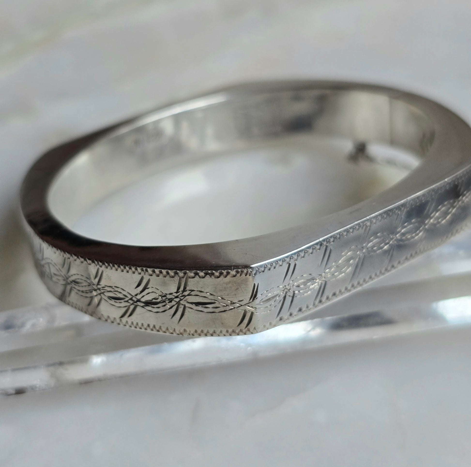 Dating to the second wave of Victorian Revival fashion during the 20th century, this satisfyingly chunky sterling silver bangle was most likely made in the late 1970s. Crafted in hollow, hand-engraved silver, it features a unique squared off, nearly hexagonal oval shape. The bracelet has a hinged opening, for a close fit, and has its original safety chain intact.